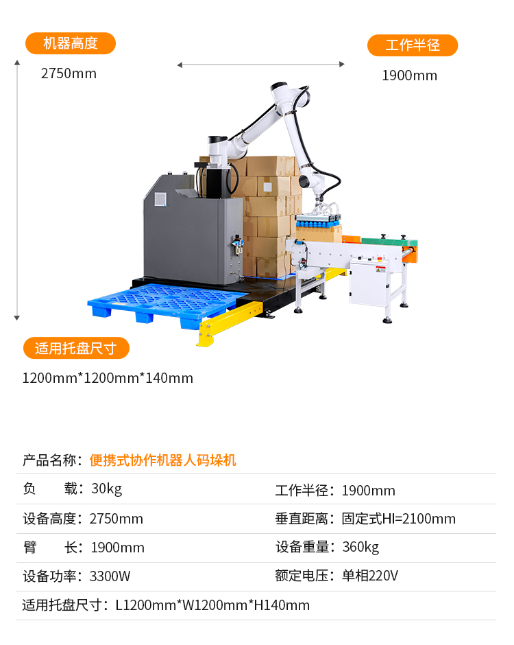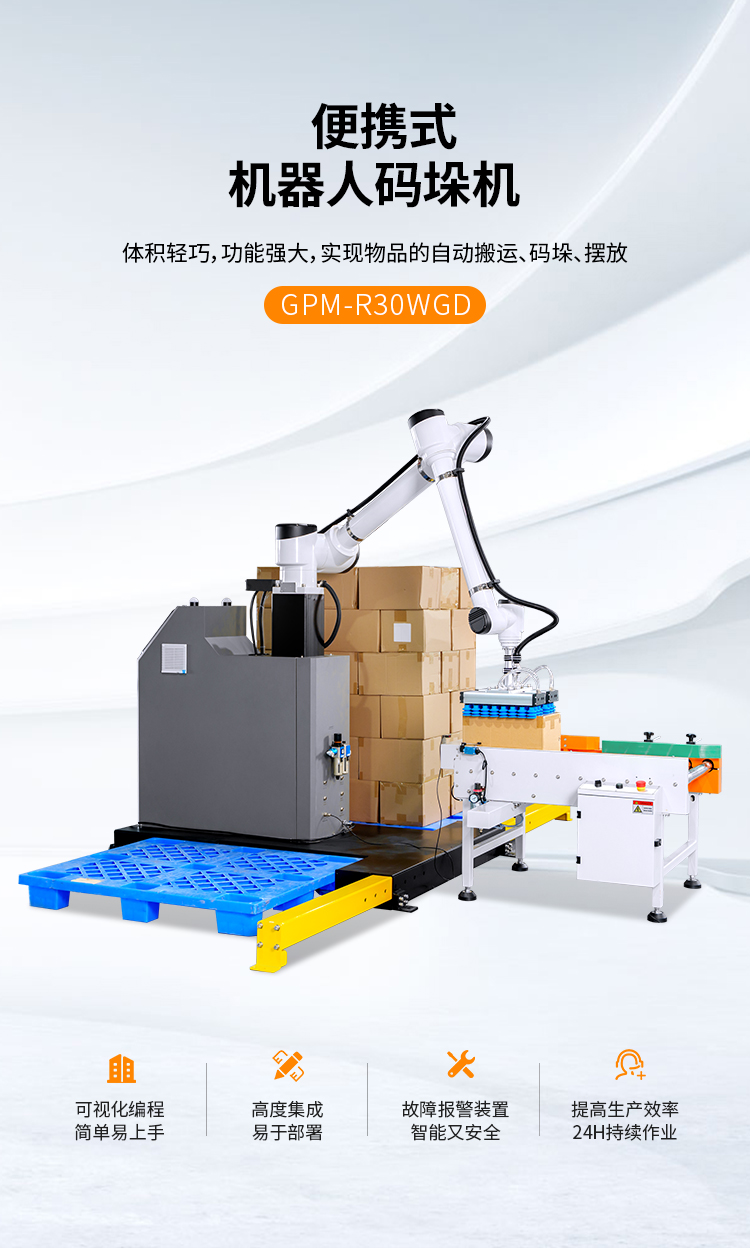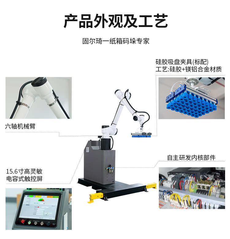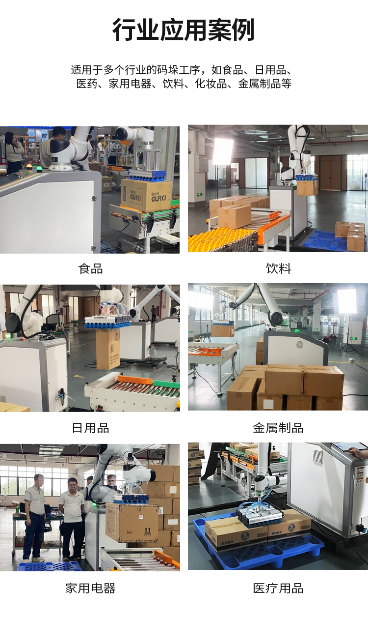協(xié)作機(jī)器人碼垛,與人類(lèi)工作人員緊密合作,提高生產(chǎn)效率、靈活適應(yīng)不同任務(wù)。安全配備傳感器,為工作人員創(chuàng)造更安全高效的工作環(huán)境,外形精巧美觀,調(diào)整方便簡(jiǎn)單,本設(shè)備采用觸控屏操作,實(shí)現(xiàn)智能化操作管理,簡(jiǎn)便、易掌握,可大大地減少勞動(dòng)人員和降低勞動(dòng)強(qiáng)度。可獨(dú)立使用也可配套自動(dòng)供棧機(jī)和棧板輸送機(jī)來(lái)實(shí)現(xiàn)全自動(dòng)碼垛系統(tǒng),廣泛應(yīng)用于多個(gè)行業(yè)的碼垛工序,如紙箱類(lèi)、醫(yī)藥類(lèi)、日用品、食品、飲料、化妝品、金屬制品等。