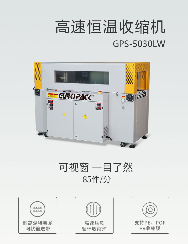 高速恒溫收縮機(jī)GPS-5030LW該機(jī)性價(jià)比高,收縮速度能達(dá)85件/分,操作簡(jiǎn)單??蓡螜C(jī)作業(yè),也可與自動(dòng)化包裝流水線配套使用。該款收縮機(jī)適用于餐飲、日化、醫(yī)藥、禮品、工藝品、玩具、五金、機(jī)械等包裝。