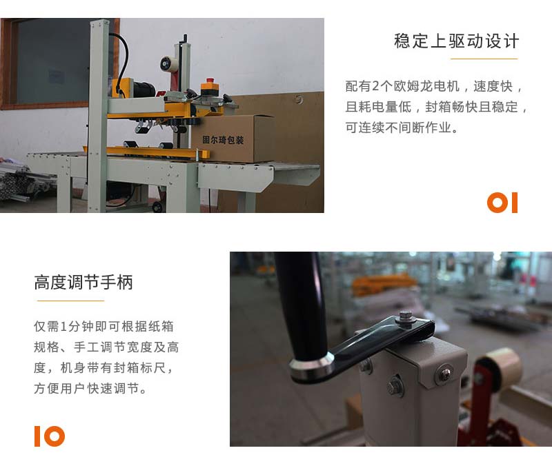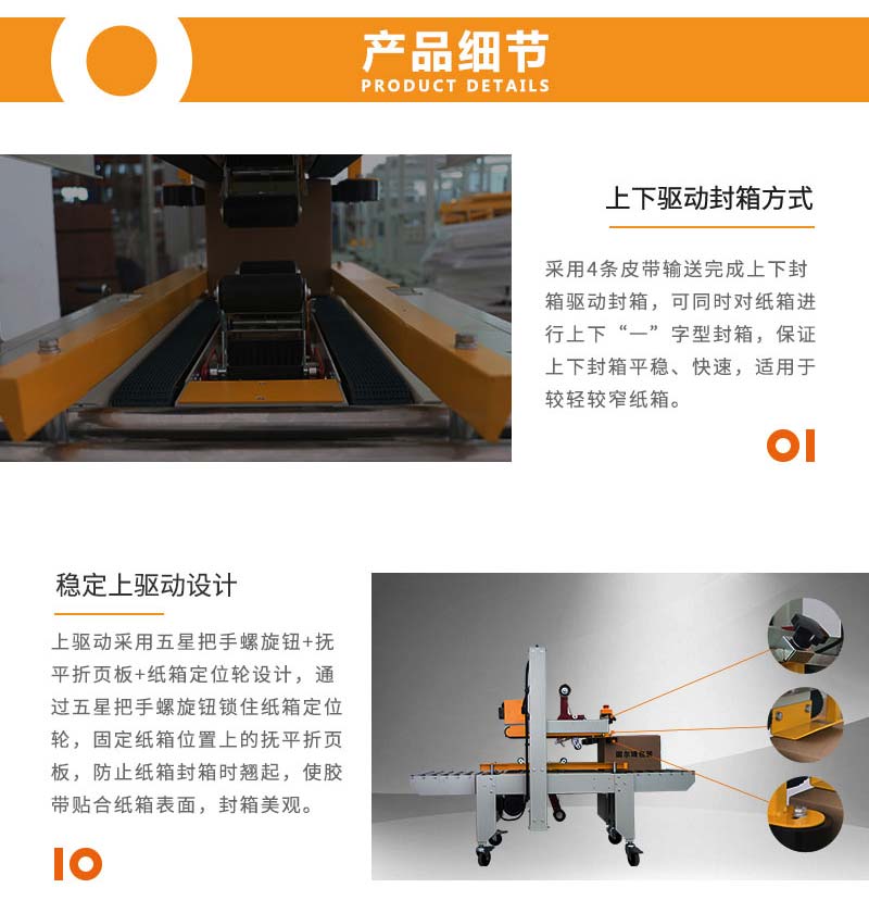 上下驅(qū)動封箱機(jī)上下皮帶驅(qū)動,適合輕型高箱;可同時對紙箱進(jìn)行上下 “一”字型封箱,上下封箱平穩(wěn)、快速,適用于較輕較窄紙箱。 該款封箱機(jī)廣泛應(yīng)用于食品、醫(yī)藥、飲料、煙草、日化、汽車、線纜、電子等行業(yè)。