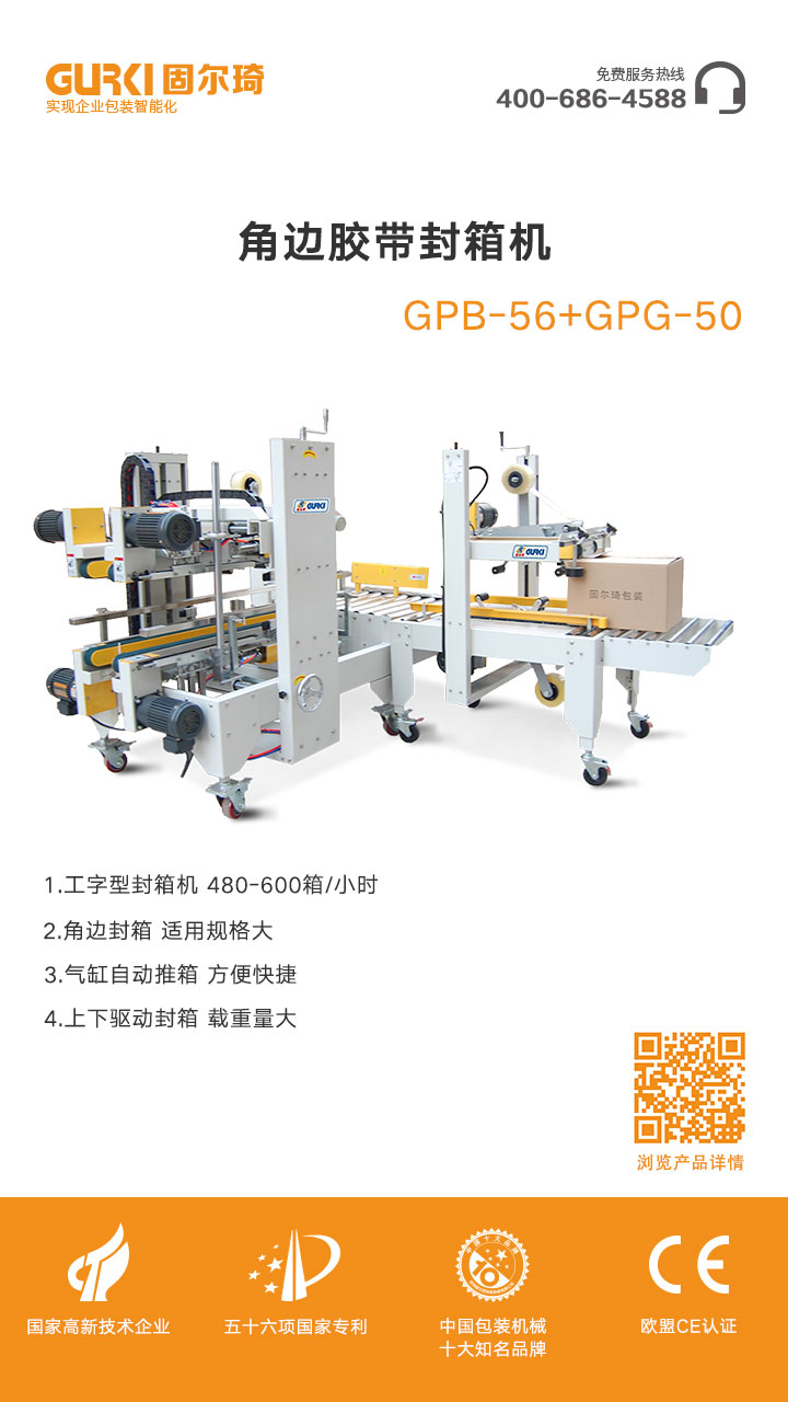 角邊膠帶封箱機GPB-56+GPG-755E的,適用多種紙箱規(guī)格,僅需手工調(diào)節(jié)寬度及高度,方便、快速;90°轉角機,氣缸自動推箱;紙箱上下四個角邊同時自動封箱、撫平、快速、平穩(wěn);可與GPA/GPB/GPC機型聯(lián)機組合完成工字型封箱機。